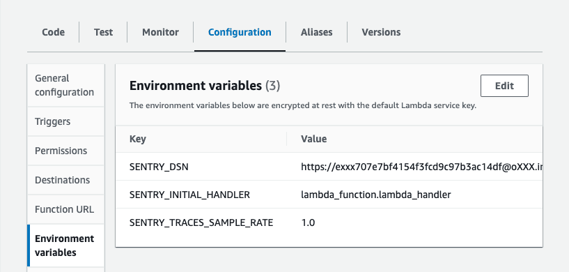 SENTRY_INITIAL_HANDLER: The handler function of your AWS Lambda function.SENTRY_TRACES_SAMPLE_RATE: This sets the sampling rate for transactions.